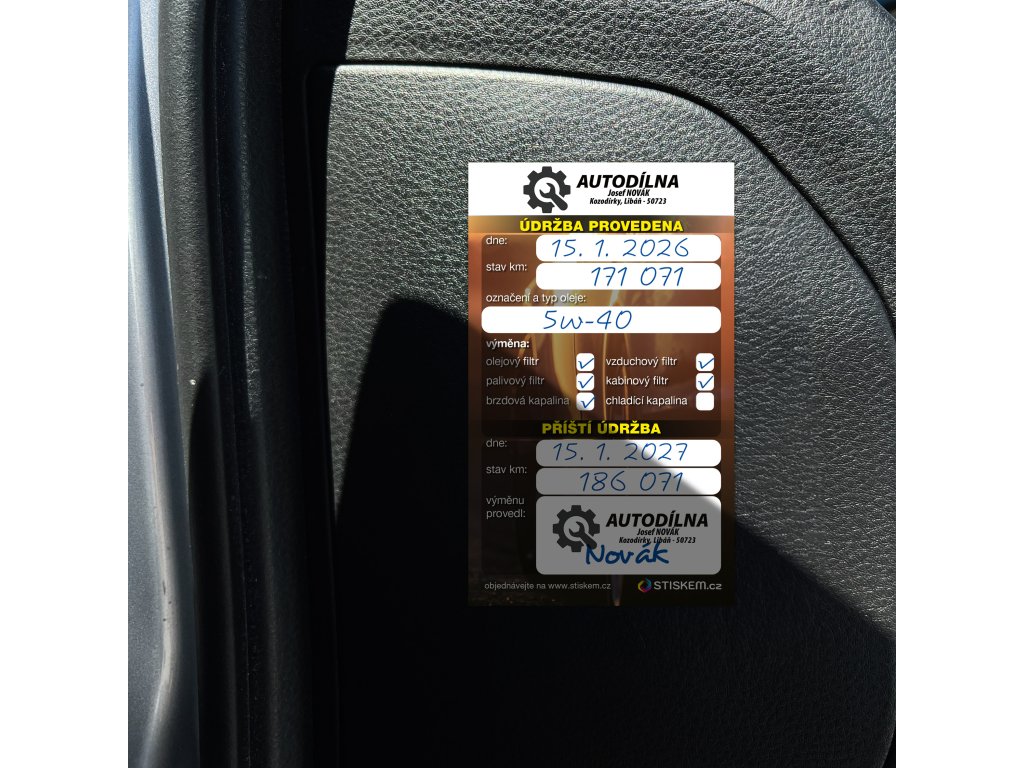 Pravidelná výměna oleje je základem dlouhé životnosti motoru. Pomozte svým zákazníkům hlídat důležité termíny. Díky rozměru 60 × 100 mm jsou všechny údaje (datum, stav tachometru, typ oleje) přehledně na jednom místě. Vaše kontaktní údaje v horní části navíc zaručí, že až nastane čas další návštěvy, zákazník bude přesně vědět, komu zavolat.