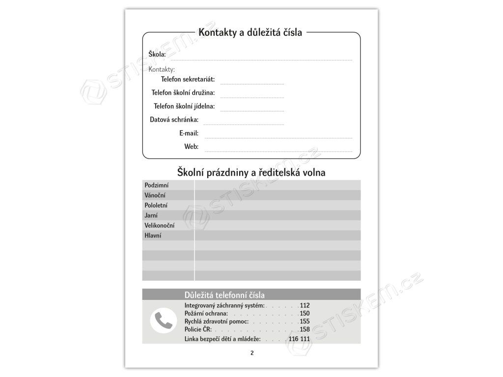 Bezpečnost především: Obsahuje seznam důležitých telefonních čísel včetně IZS (112), záchranné služby (155) a Linky bezpečí (116 111)
