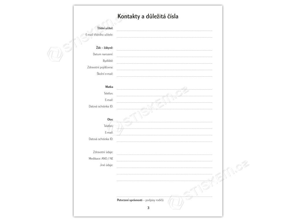 Zdravotní údaje: Vyhrazené místo pro informace o zdravotní pojišťovně, medikaci a jiných důležitých zdravotních aspektech žáka.